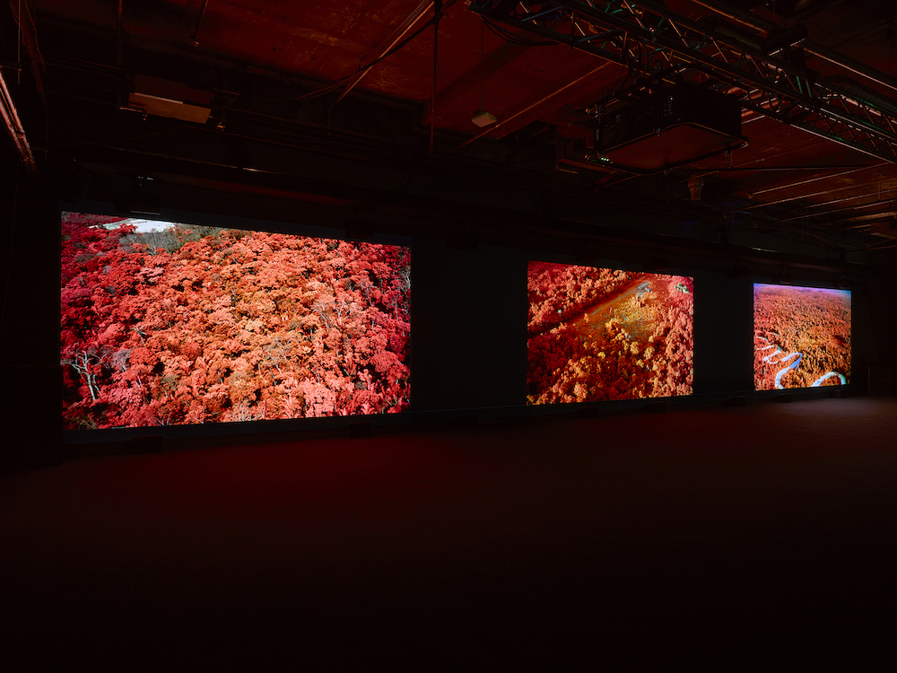 Visually arresting in its aerochrome strangeness and temporal ambiguity, Richard Mosse’s latest exhibition “Broken Spectre” at 180 The Strand in London overwhelms with sublimity and horror, deploying vibrant hues of alizarin crimson, amaranth, scarlet, vermillion, madder, and lac in a contemporary depiction of environmental devastation in the Brazilian Amazon.